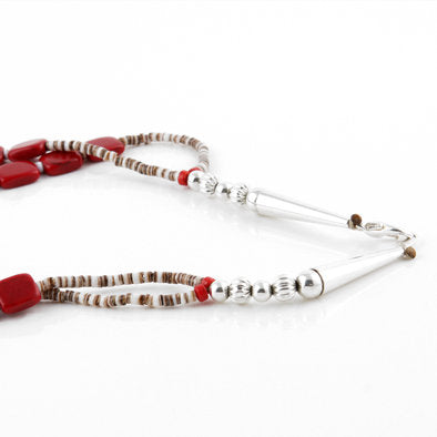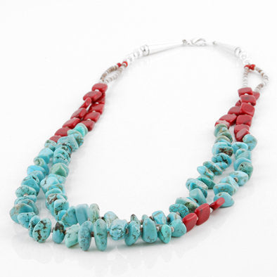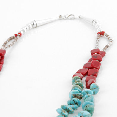 This lovely necklace features 100% natural turquoise stones which range from about 1/4" long to about 5/8" in length The bright blue turquoise is complimented beautifully by deep red jasper beads. An asymmetrical placement of 3 red jasper beads really makes this necklace uniquely fashion-forward. The jasper measures 1/4" x 3/8". The tiny beads in between the bigger beads are the gemstone Spiny Oyster. The necklace itself measures about 24" in length.