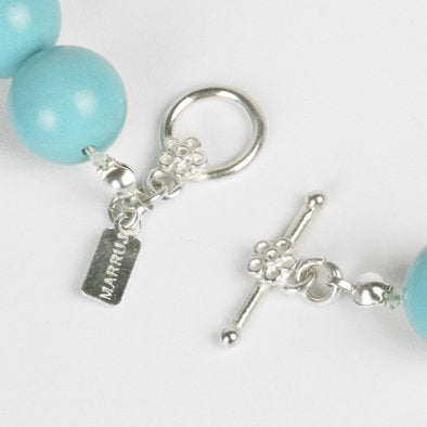 This absolutely stunning natural Sleeping Beauty stabilized turquoise necklace features beads knot-strung together which measure about 1/2" (13mm) in diameter each. The necklace measures 19" long, and features a silver round toggle clasp t-bar closure connector. Turquoise beads are always a fashionable choice. They would compliment a more natural outfit beautifully, or they would add a beautiful contrast to a more sophisticated look. Marrujo is a master designer of this necklace which is stated on a small silver tab.Stabilized turquoise is the most common type of turquoise available on the market. Since most of the extracted turquoise is unusable in its natural state, stabilization allows it to improve its characteristics.