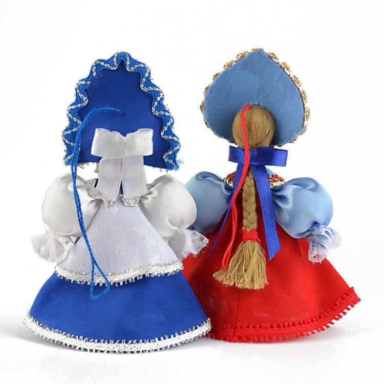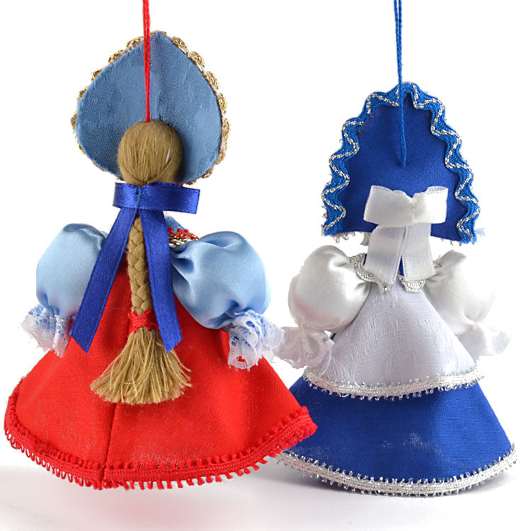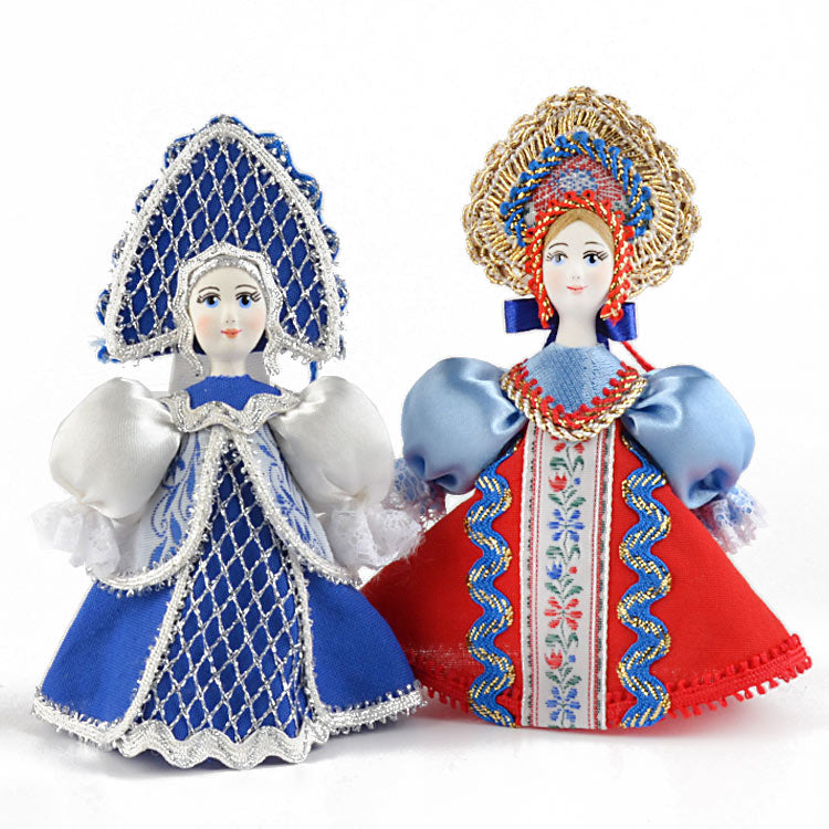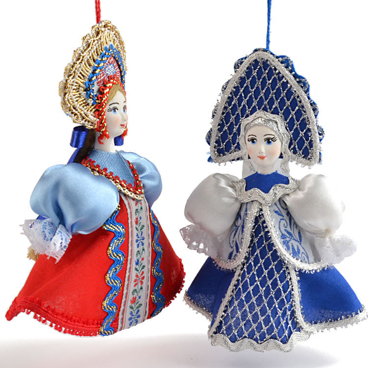These dolls were made with porcelain faces that have been hand-painted, and traditional Russian clothing that was stitched with many different types of fabrics. These are gorgeous ornaments for the tree or darling decorations anywhere around the house, all year long, as the Russian dolls look great standing up on their own as well. These princesses are Approximately 5" tall and have wonderful detail.