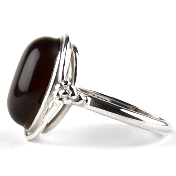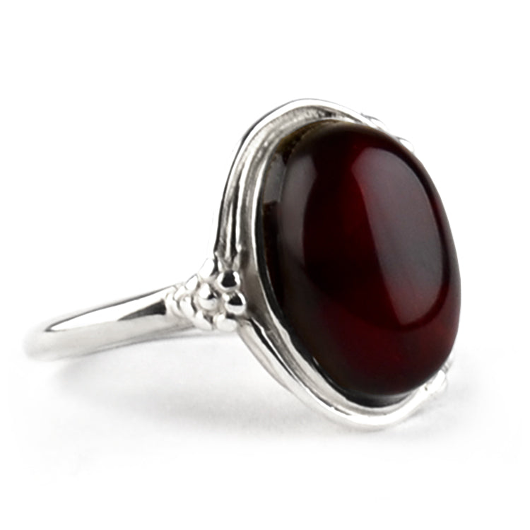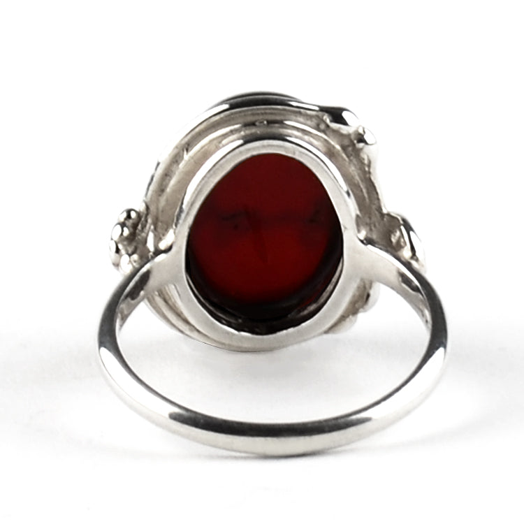 This genuine oval shaped cherry Baltic amber stone is set in an artistically designed sterling silver frame. It is a one-of-a-kind handmade ring. The face of the ring measures about 3/4" long and 5/8" wide. Comes in size 9. The amber comes from the Baltic regions in Russia. This classic ring is fashionable and can be worn with any outfit.Each piece of our jewelry is hand crafted and each amber stone has its own uniqueness, therefore they might slightly differ from the photograph. Colors of the amber stone/s might slightly vary from its photos. The digital images we display have the most accurate color possible. However, due to differences in computer monitors, there may be variations in color between the actual product and your screen.