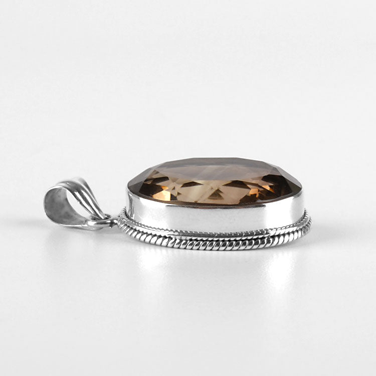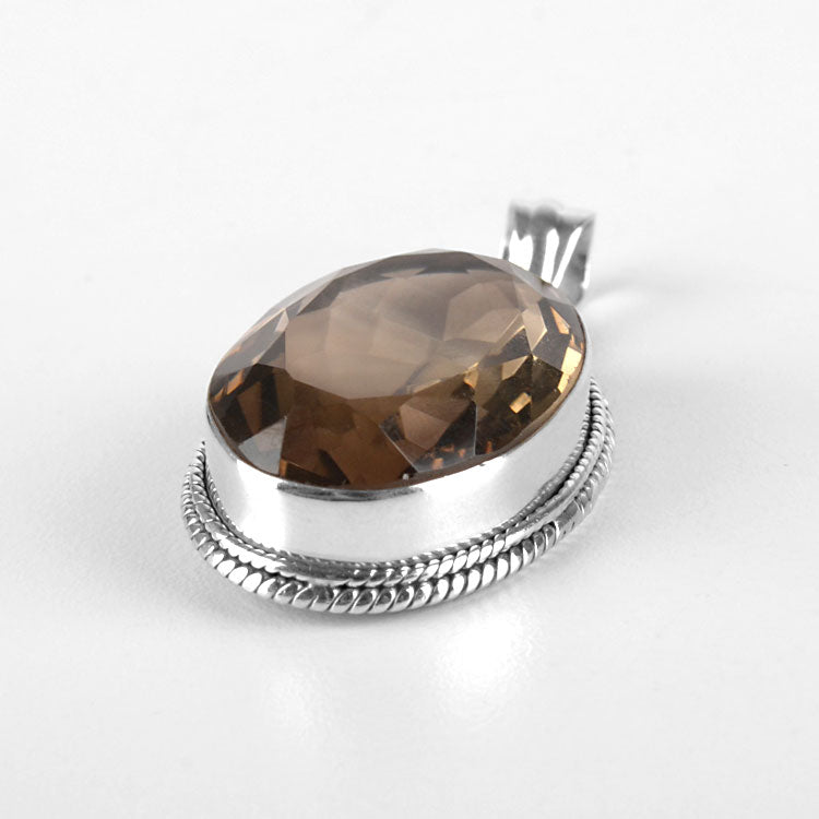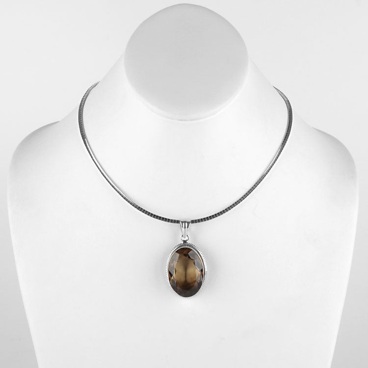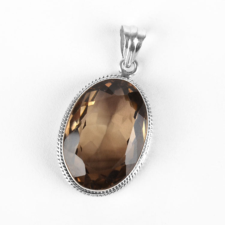 Add this smokey quartz pendant to your wardrobe for a unique way to wear brown fashionably! This large pendant (about 1 3/4" total length) is ideal for just about anyone. The oval gemstone has been faceted so that every way you look at it, you see different shades of tan. Set in slightly stylized sterling .925 silver. Looks great with many different styles of chains!