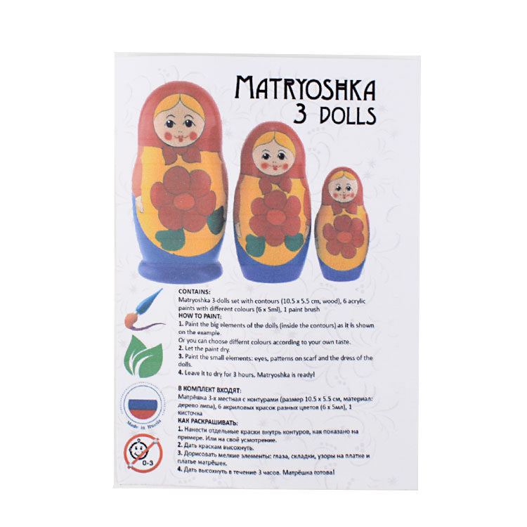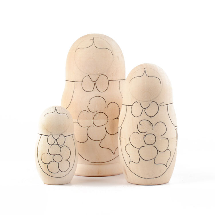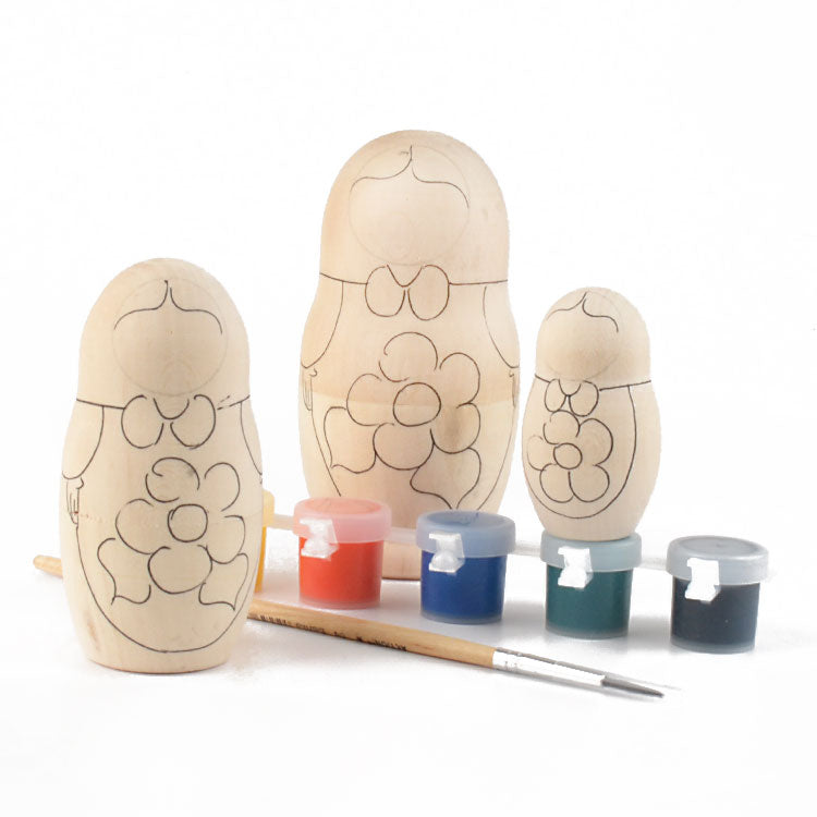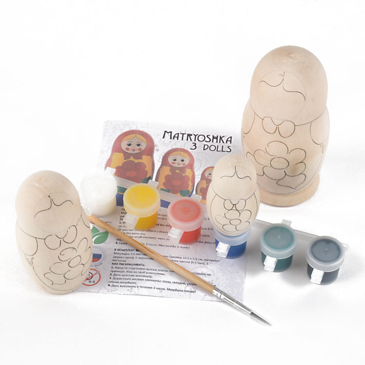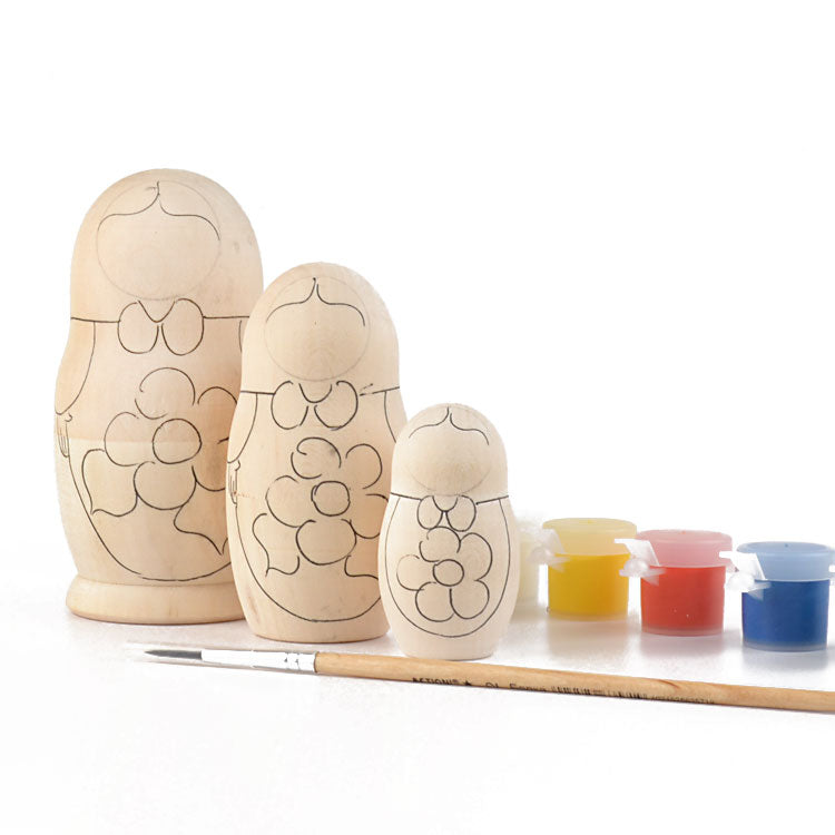 Paint-your-own nesting doll comes with instructions, paints, a paintbrush, and a 3 piece wooden nesting doll. Largest stacking doll is about 4 1/4" tall. Makes a great gift for kids and adults. Imported from Russia.