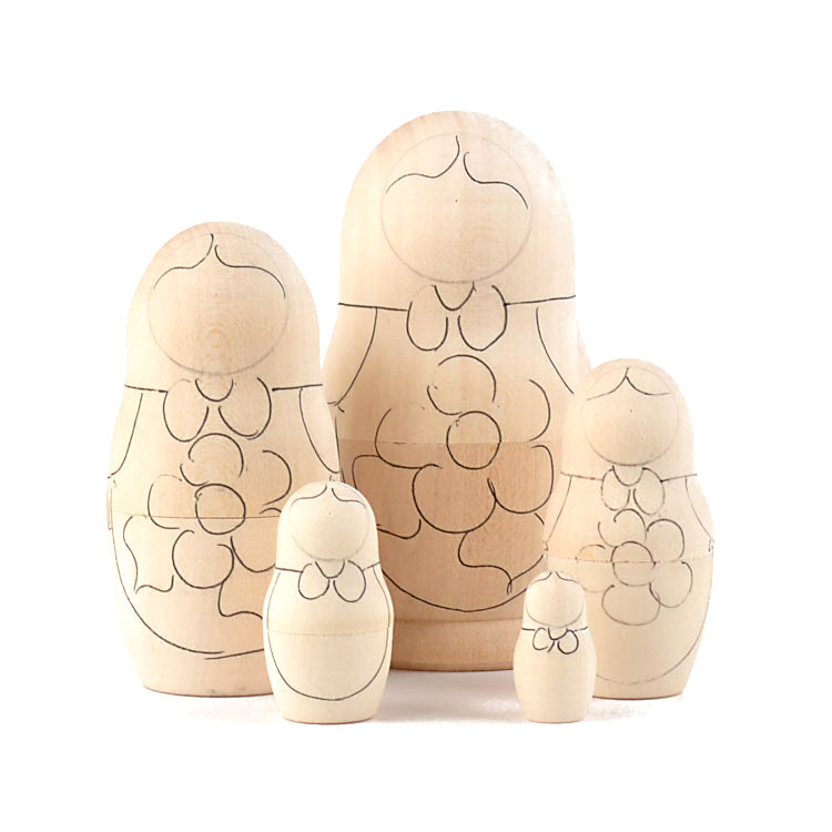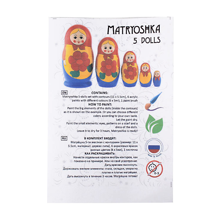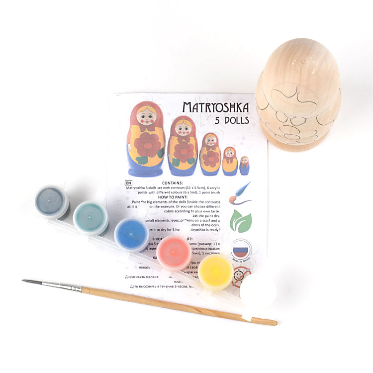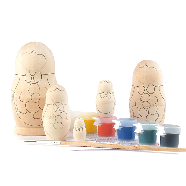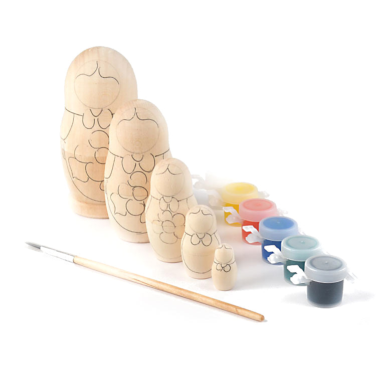 Paint-your-own Russian nesting doll comes with instructions, paints, a paintbrush, and a 5 piece wooden nesting doll. Largest stacking doll is about 4 1/4" tall. Makes a great gift for kids and adults. Imported from Russia.