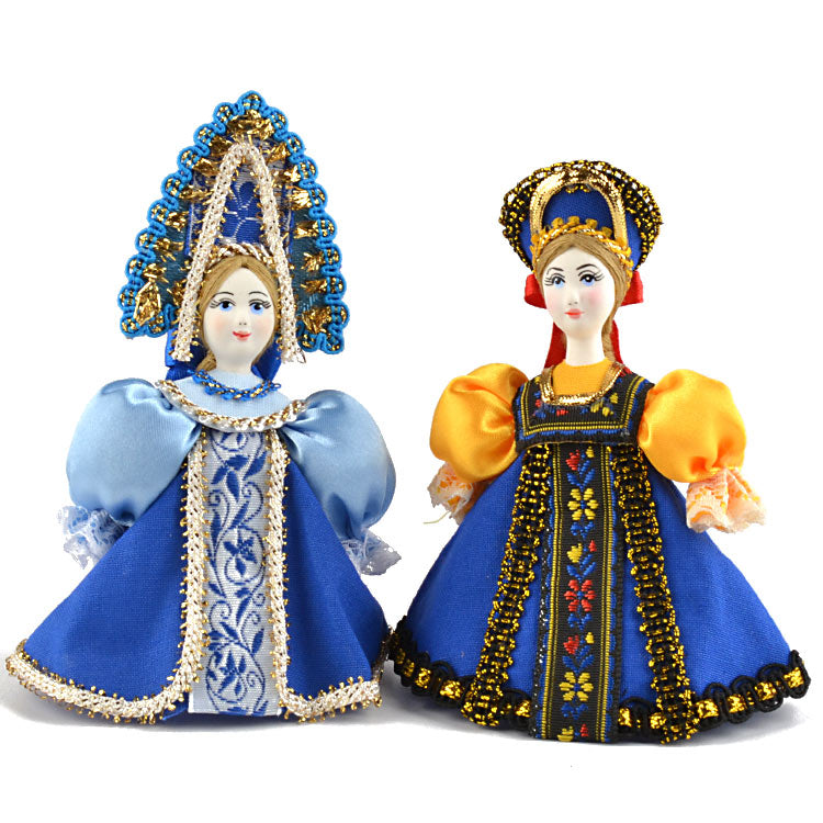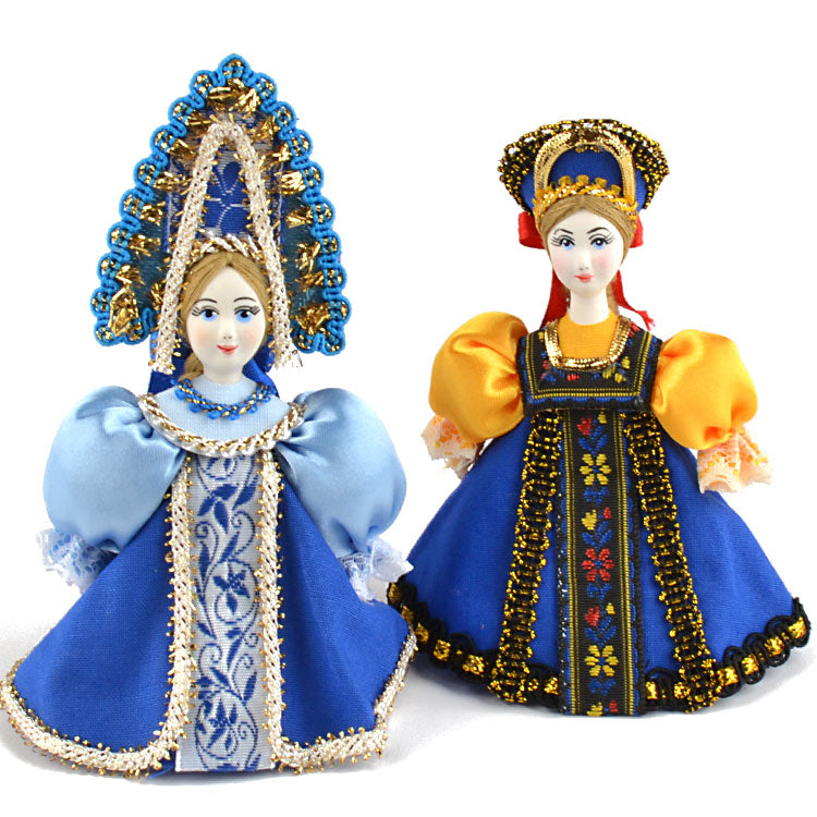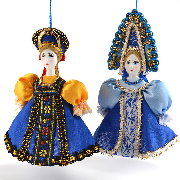 These Russian dolls are hang-able and made of porcelain faces that have been hand-painted, and traditional Russian clothing that was stitched with many different types of fabrics. These are unique ornaments for the tree or darling decorations anywhere around the house, all year long, as the Russian dolls look great hanging or standing up on their own as well. These are Approximately 5" tall each and they have wonderful detail.