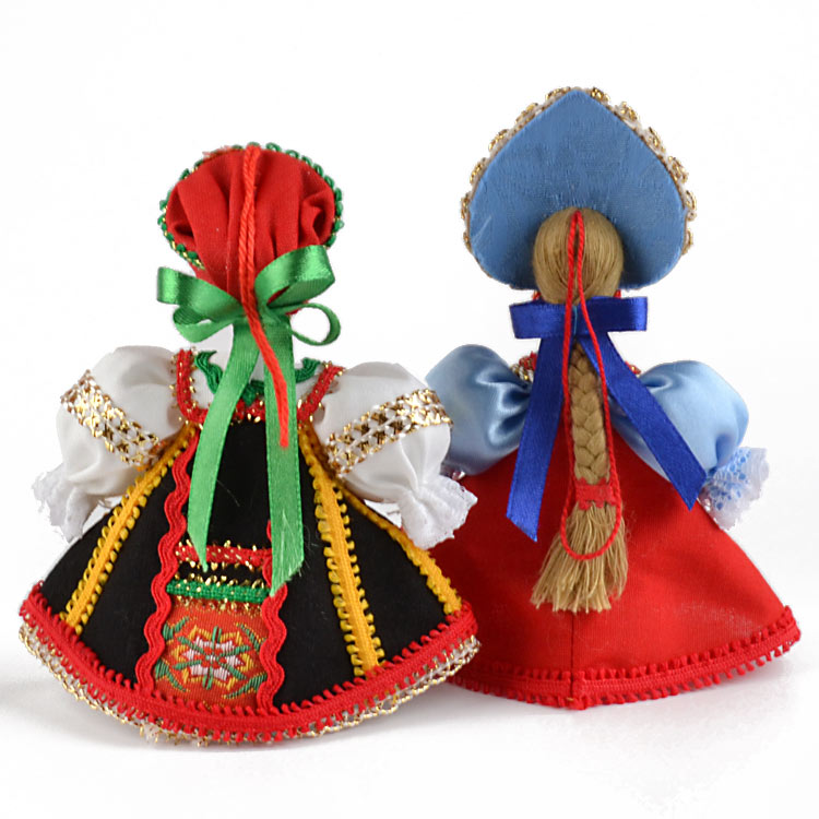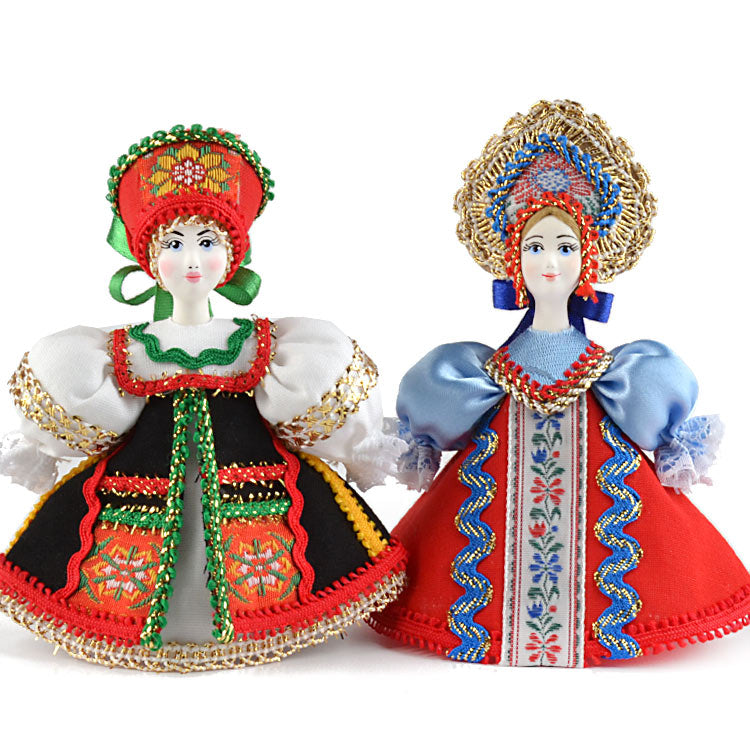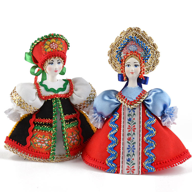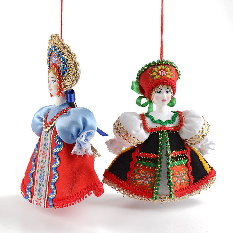 These fun and pretty Russian dolls are hang-able and made of porcelain faces that have been hand-painted, and traditional Russian clothing that was stitched with many different types of fabrics. These are unique ornaments for the tree or darling decorations anywhere around the house, all year long, as the Russian dolls look great hanging or standing up on their own as well. These are Approximately 5" tall each and they have wonderful detail.
