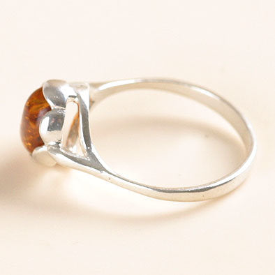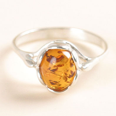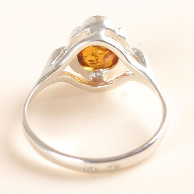 This sterling silver ring features a honey amber stone measuring Approximately 9mm by 7mm, and is imported straight from Russia. This piece of jewelry is designed to be unique yet classic.