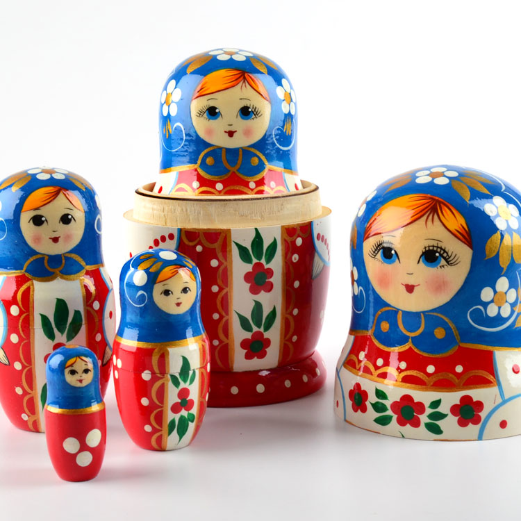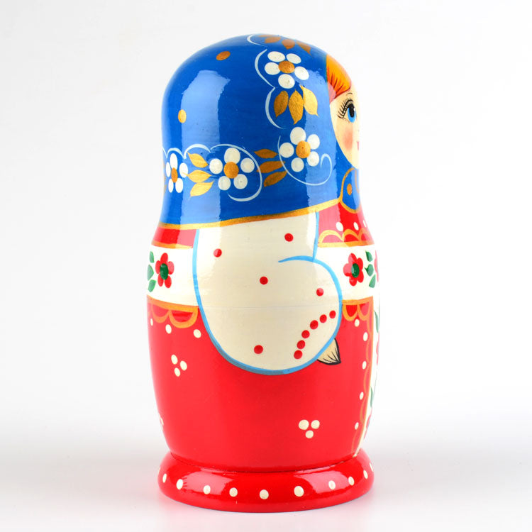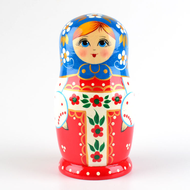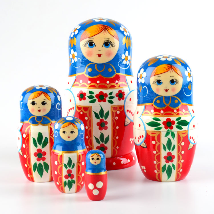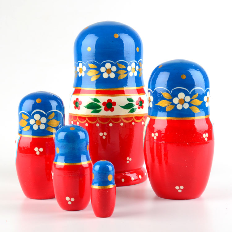 This hand-crafted wooden Russian nesting doll features red, white, and blue colors with a floral theme and green and gold colored accents. She is about 6.5" tall. Brighten up a room or someone's day with an authentic Russian nesting doll like this one!