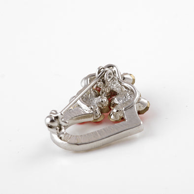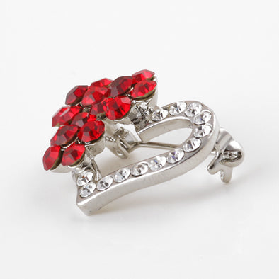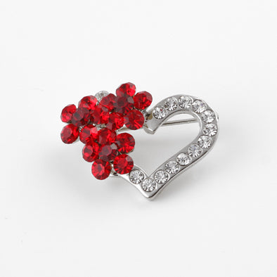 This cute heart pin features a silver tone heart glittering with pavé white Austrian crystals accented by a cluster of three red crystal flowers.