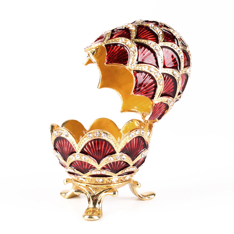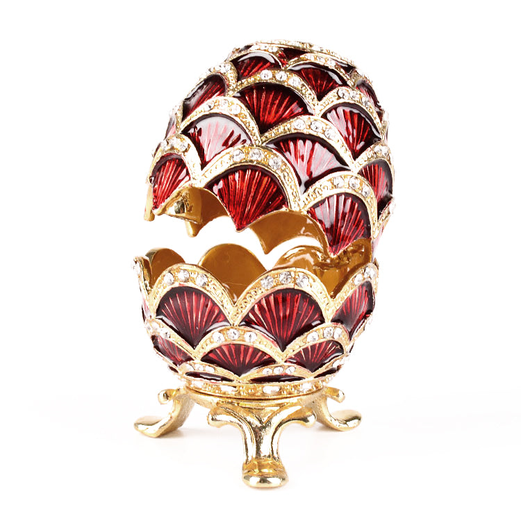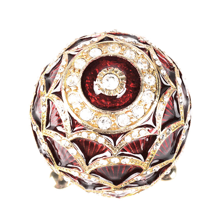 This gold and red Faberge style trinket box makes Easter (or anytime, really) fun! It was made with a pewter base, then hand enameled, and lastly decorated with sparkling Austrian crystals. It has a strong magnet to hold the two halves together. It also features gold accented trim work and the egg comes complete in a satin-lined gift box.