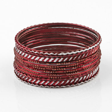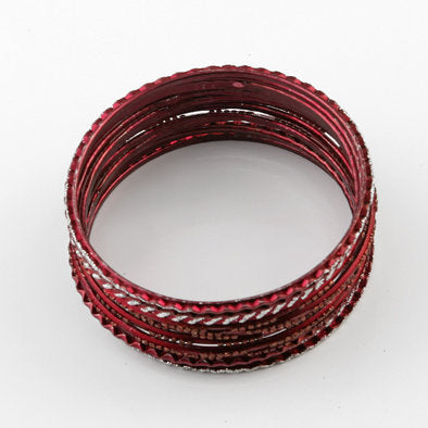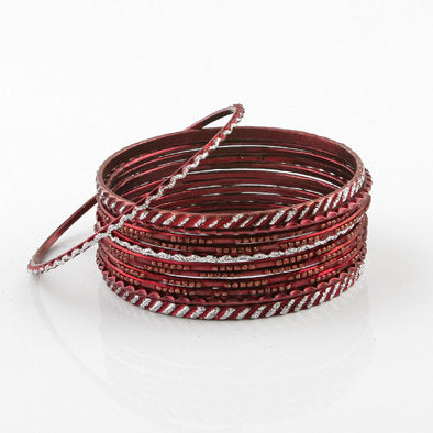 Wear this set of glitter red bangle bracelets Mixed with silver jewelry to add a bit of color to your ensemble. Each bangle features a different glitter design. Comes with 12 bangles.