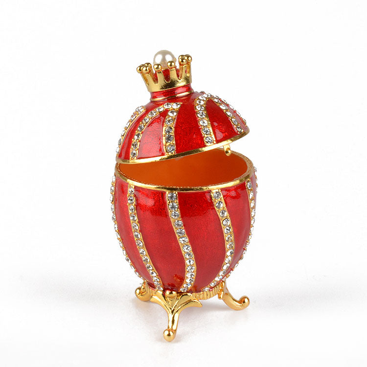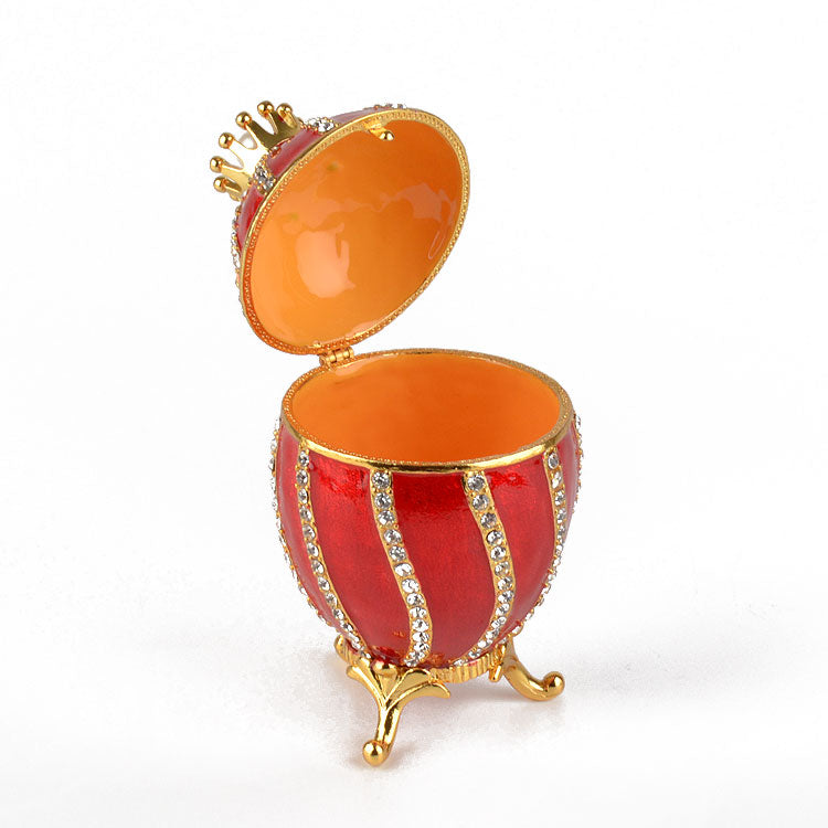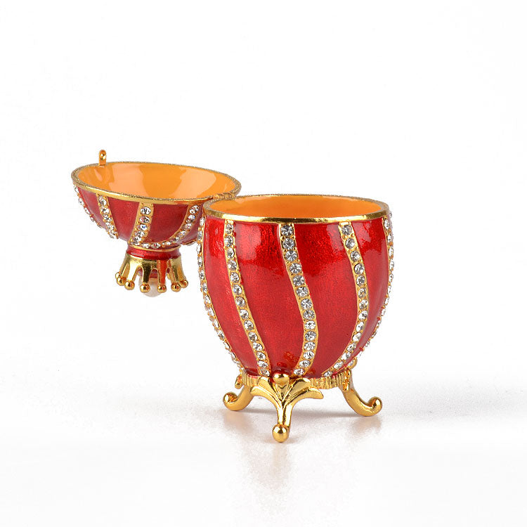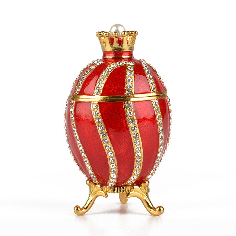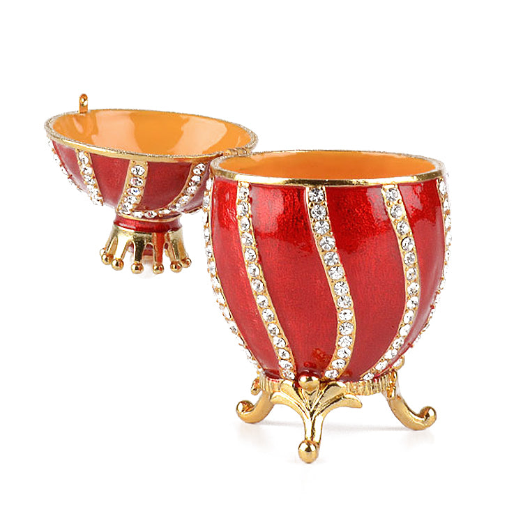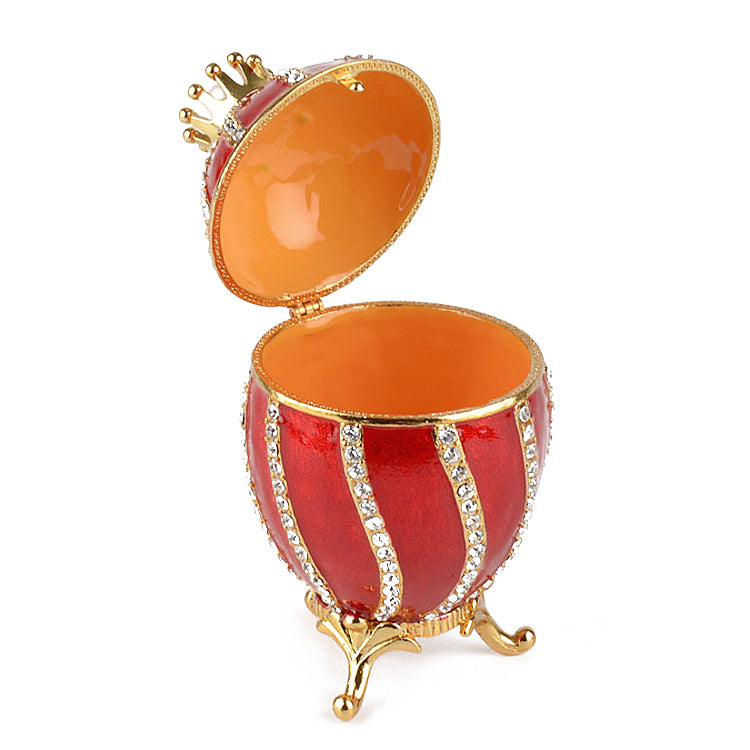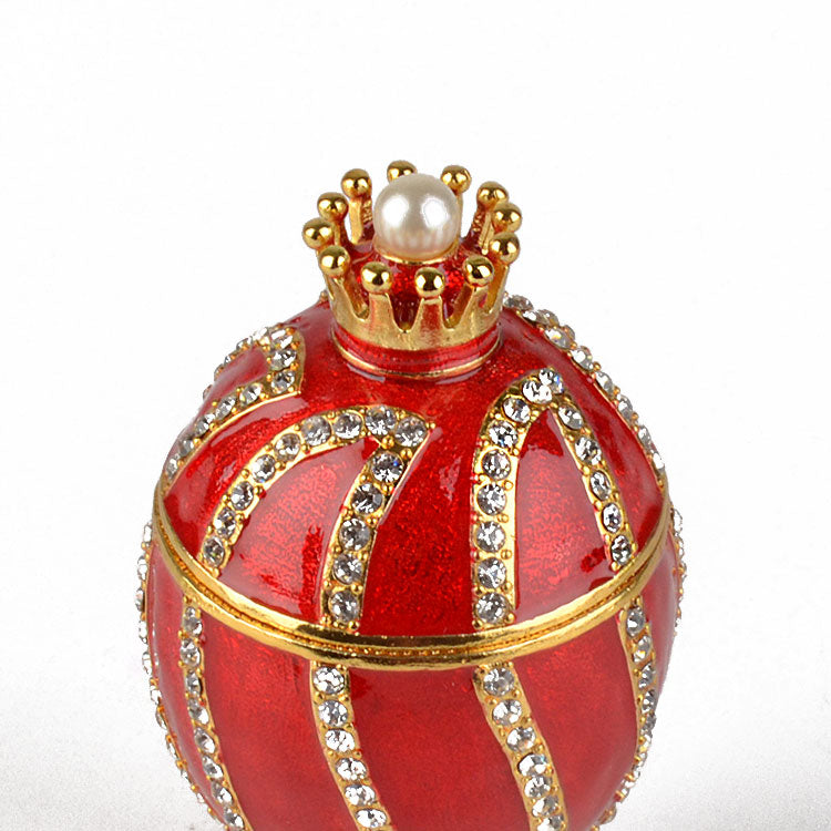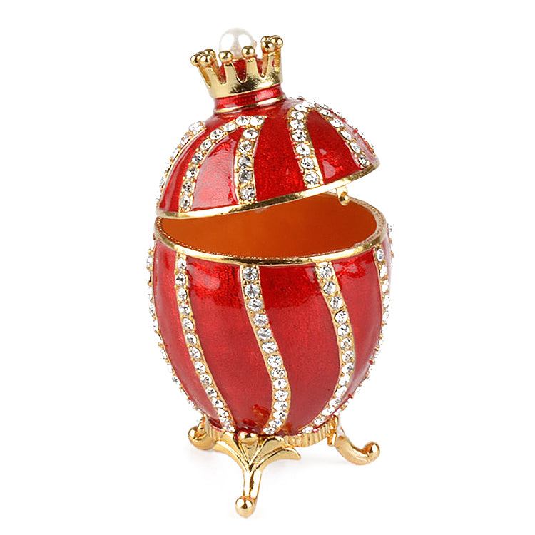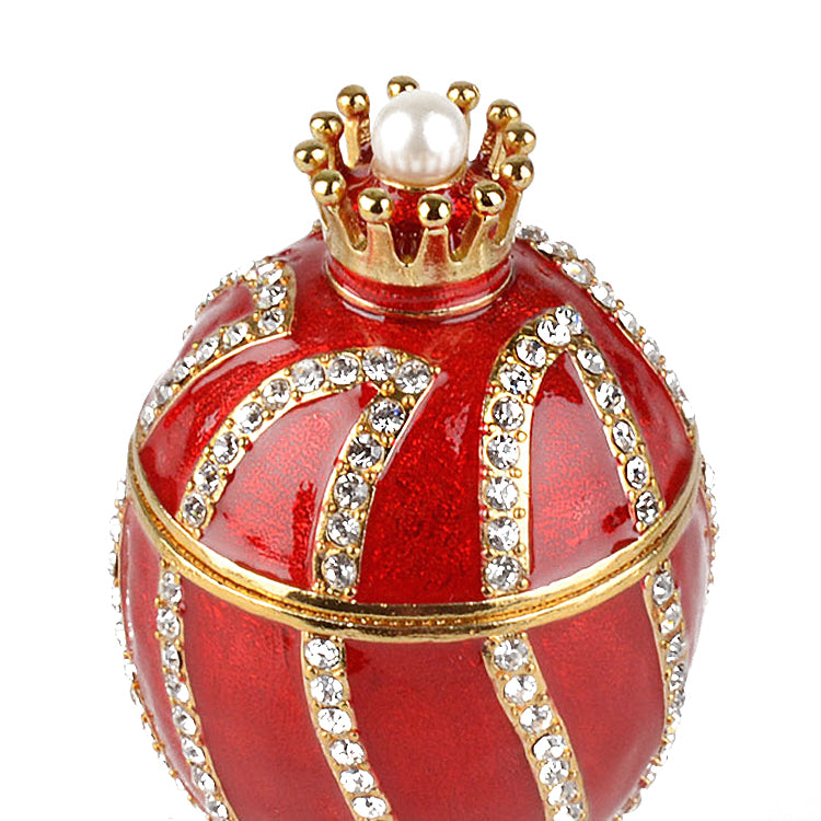 This red and gold egg box is modeled after the famous faberge eggs. It features dozens of sparkling clear crystals, gold plated trim, and a spacious interior. In addition, this egg has a crown and pearl on the top. The box opens and closes with ease, by way of hinge and clasp. This egg is a great gift for anyone. About 4 3/4" tall and about 2 3/4" wide.