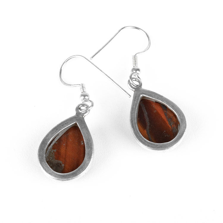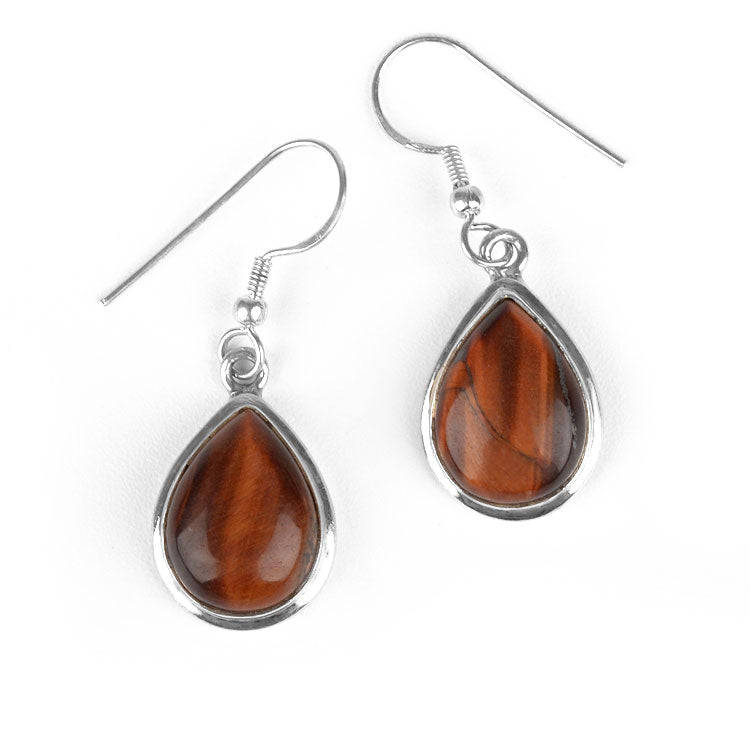 These drop-shaped, never-go-out-of-style design red tiger-eye gemstone earrings are about 1 5/8" in total length. The natural chatoyancy (inner glow) of these banded gems is striking. Set in sterling .925 silver and finished with simple hooks.