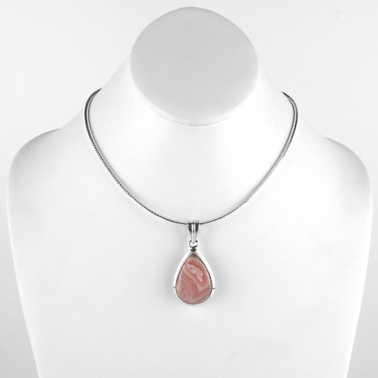 This drop of pink rhodochrosite gemstone is set in a framework of sterling silver. The natural stone is Approximately 1" long and 3/4" wide and is a prime example of fine world gemstones. This beautiful piece was carefully hand-carved and polished to bring out its inherent beauty. Total length of pendant is about 1 3/4" long, total width is slightly under 1" wide.