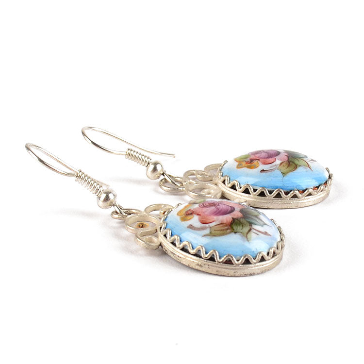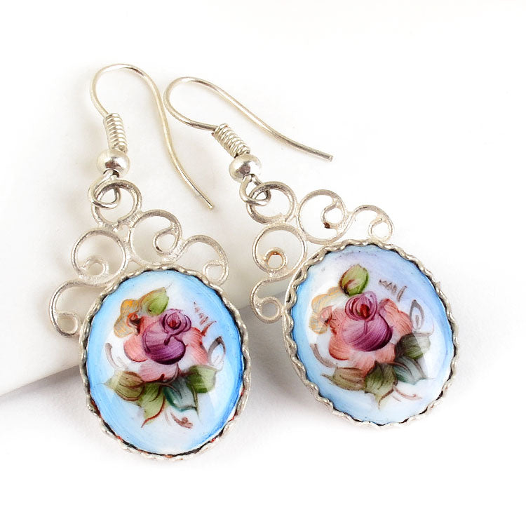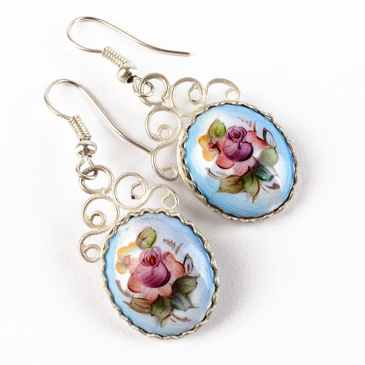 Hand crafted with an outlined German silver filigree that has a decorative spring and ball on the simple hooks, these Rostov Finift Enamel earrings are blue-hued and look great with many outfits! They are Approximately 1 3/4" in total length and about 1/2" wide.