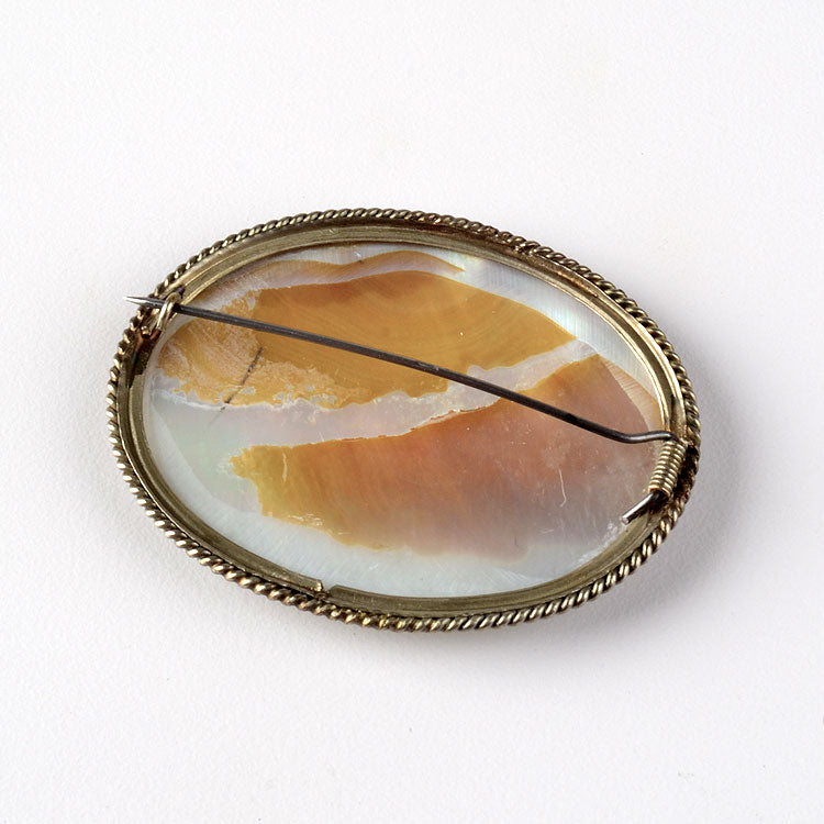 This beautiful pin/brooch was made in Russia and it features a miniature painting of a Winter scene with a church in the background. The mother-of-pearl shines effortlessly with luminosity, and it is set in a German silver border. This brooch has the artist's initials on the front and a simple pin on the back.