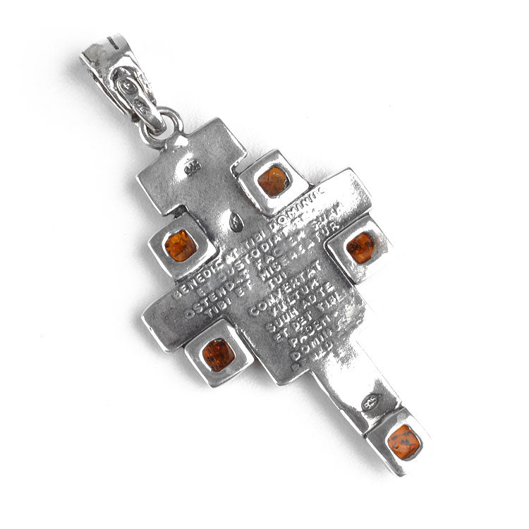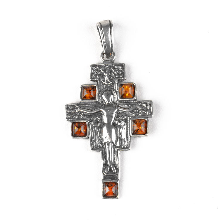This beautiful and religious piece of jewelry was made with sterling silver and five authentic amber stones (approximately 1/8" x 1/8"). The 2" long, 1" wide pendant has a prayer on the backside. This San Damiano Cross (a Byzantine style Icon Cross) is best known because it is beneath it that Saint Francis was asked by Christ to: "Build my Church." This Russian pendant does not include a chain; chains can be purchased separately here at The Russian Store.