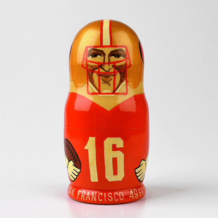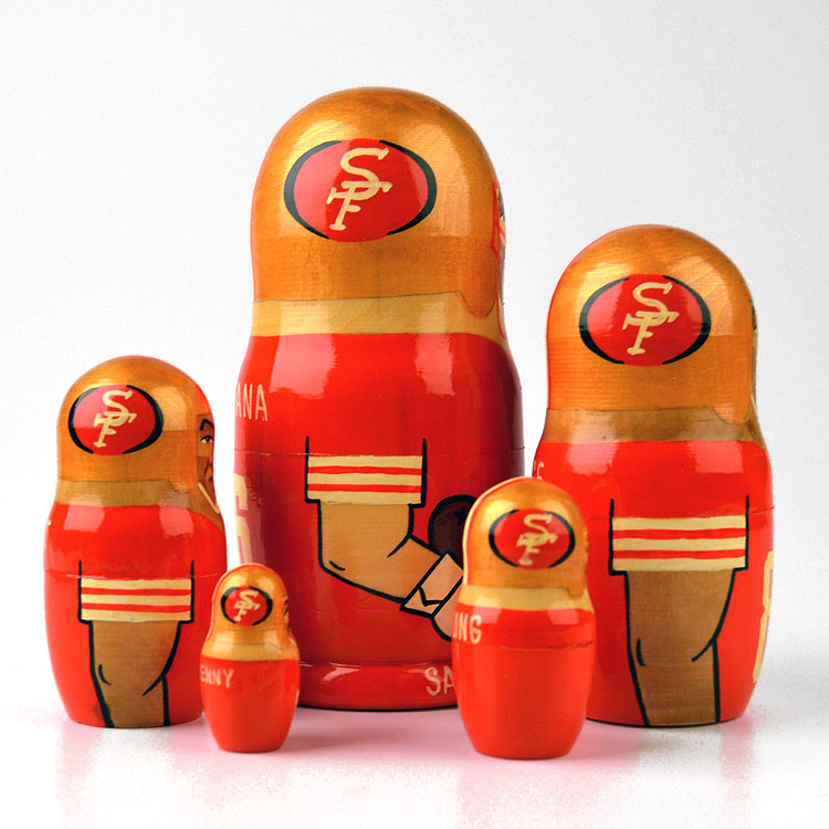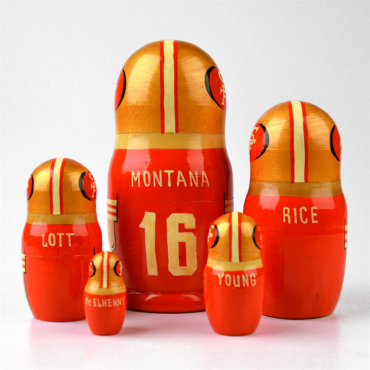 This sports memorabilia of a hand-crafted set of Russian nesting dolls, features the San Francisco 49ers. It was made in Russia in 2006. It's a great gift for any avid Niners fan as each doll features a different San Francisco football players including: Montana, Rice, Lott, Young, and McElhenny. Would look great on a mantle next to any other sports memorabilia. Give it as a gift, and it's sure to put a smile on any football fanatics face.