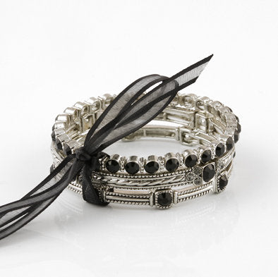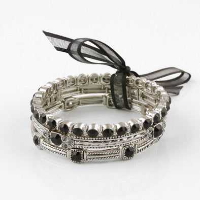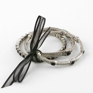 This fashion bracelet set comes with three different silver tone stretchable metal bracelets featuring glinting black faux gemstones. One of the bracelets features clear grey crystals accenting the black stones, set in ornate silver tone metal. The three bracelets come tied together with a pretty black ribbon.