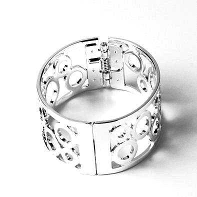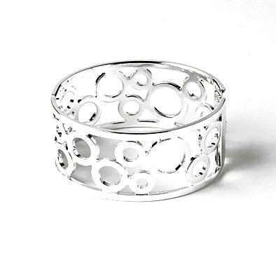 A wide band of silver tone metal circles of assorted sizes fill the hinged silver frame of this chunky fashion bracelet.