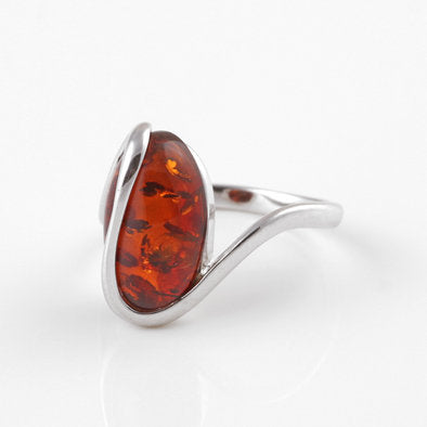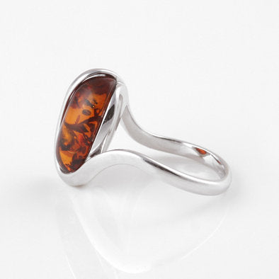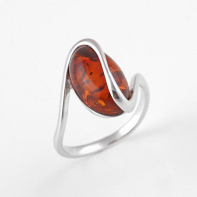 This bold but simple ring features a cognac amber oval held in place by a twist of .925 sterling silver overlay. Amber features unique natural inclusions.