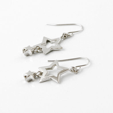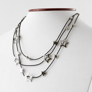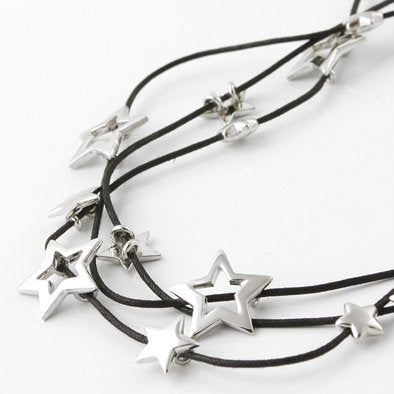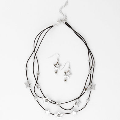 Cute silver tone metal stars dot the black cords of this layered multi-strand necklace. The matching earrings feature a small and a large star dangling from simple silver hooks.