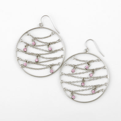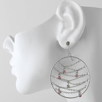 These unique fashion earrings feature a large silver tone hoop the interior of which is ornamented with criss-crossing silver tone chain. The chain is dotted with small, round pink rhinestones, giving the earrings a bit of sparkle and a dash of color.