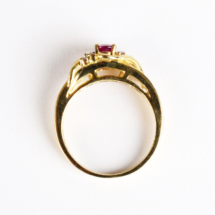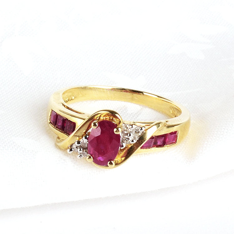 This beautiful ruby ring is made with genuine 14 karat yellow gold and is size 7. A line of square cut rubies leads up to one 0.65ct center stone in a classic 4 prong setting. Small diamonds and a wave of gold decorate either side of the center ruby stone.