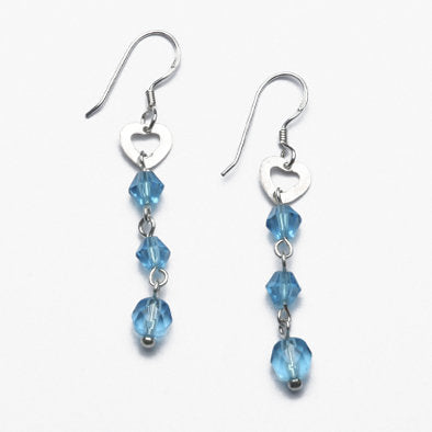 This stunning pair of earrings feature sterling silver hearts resting atop three beautifully vibrant blue crystals. The earrings have a length of 2" and a width of 5/16". The smaller stones measure 3/16" x 3/16", while the larger stones measure 1/4" x 1/4".