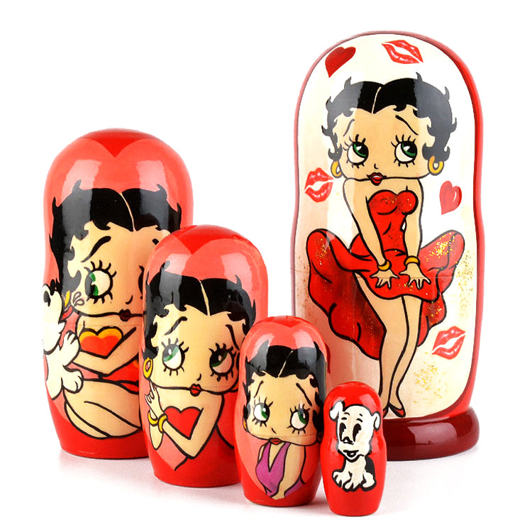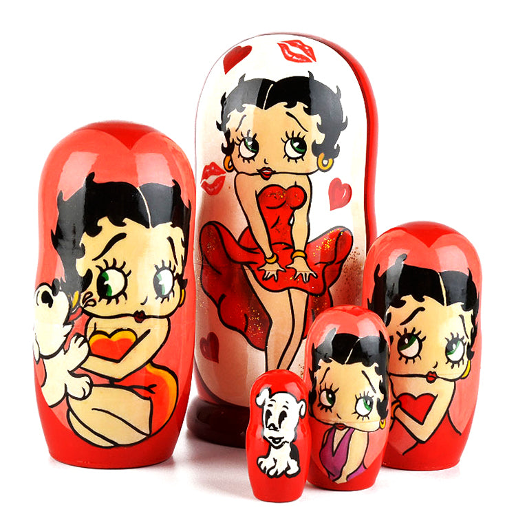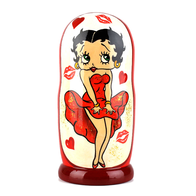 Boop boop de-doop! Betty Boop looks fabulous on this 7" handmade nesting doll. This lovely cartoon character doll was painted with a vibrant red hue and some pink and then it was highly glossed. It was even accented with gold sparkles. It is a striking home decor piece that anyone can appreciate. Makes a unique gift around Valentine's Day. hand-crafted; designs may vary slightly from picture.
