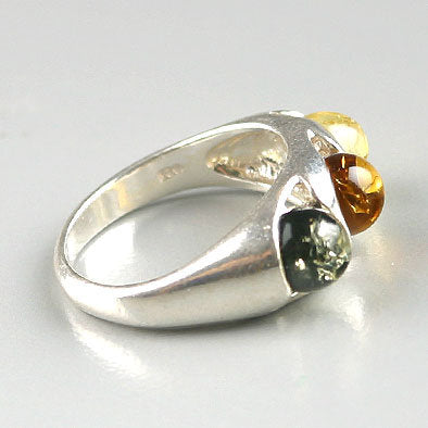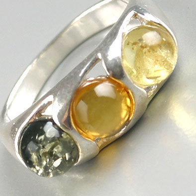 This contemporary sterling silver ring has a shape of a band with three different color amber stones set in it.