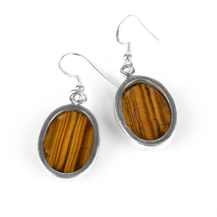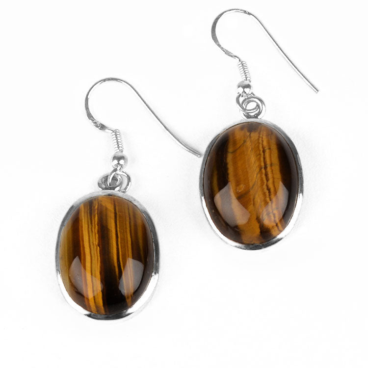 These classic, never-go-out-of-style design tiger-eye gemstone earrings are about 1 3/4" long, with the beautiful brown gemstone being approximately 7/8" x 5/8" in size. The natural chatoyancy of these banded gems is striking. Set in sterling .925 silver and finished with simple hooks.