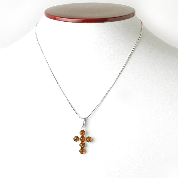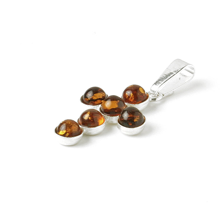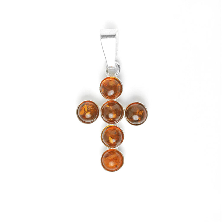 This classic pendant features six round honey amber stones set in genuine .925 Sterling Silver. The stones measure Approximately 3/16" in diameter. The pendant as a whole measures 1 1/2" in length and 3/4" in width.
