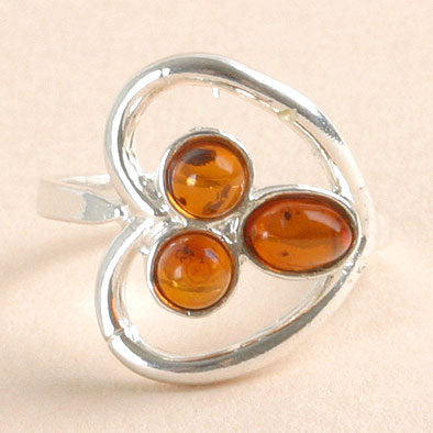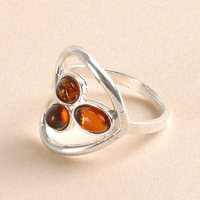 This delicate amber ring is composed of three honey color amber stones that are set in sterling silver. The entire setting measures 3/8" x 1/2".
