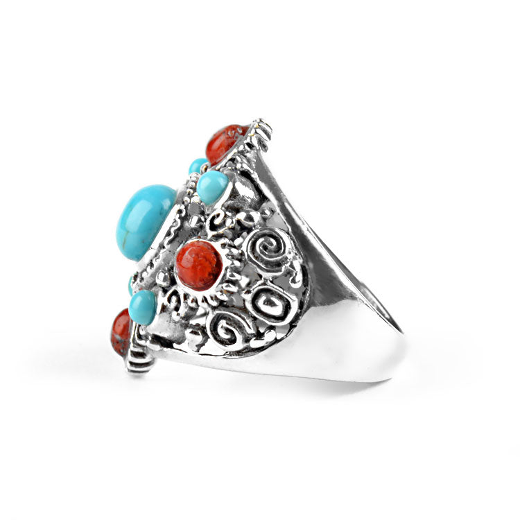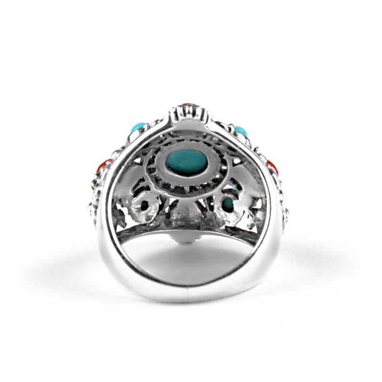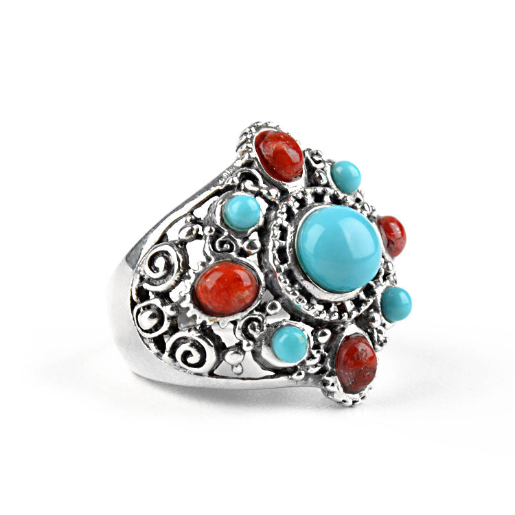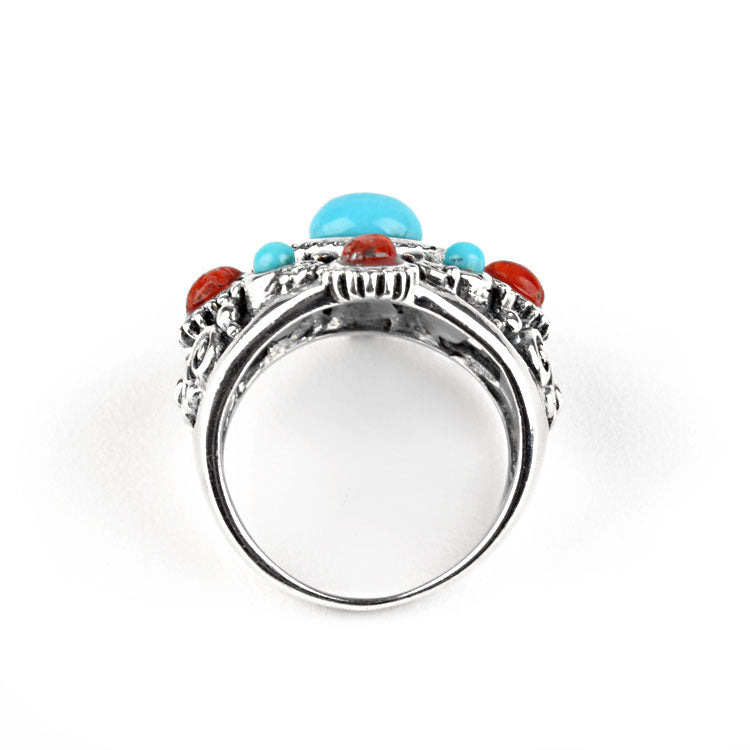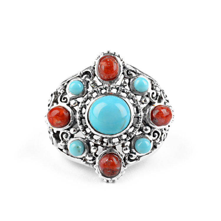 This very beautiful size 7 ring combines natural turquoise and natural coral gemstone beads situated in a unique and interesting design of sterling silver swirls. The center turquoise stone, the largest of them all, is about 1/4" in diameter. The entire face of the ring is approximately 1" x 1" in size. This fashionable ring is also quite comfortable.