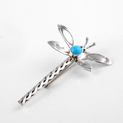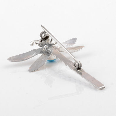 This silver dragon fly pin features a natural turquoise stone. The dragonfly pin measure 2" in length, and would make a great gift, or addition to your own personal jewelry box.