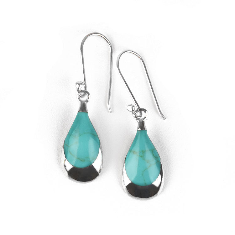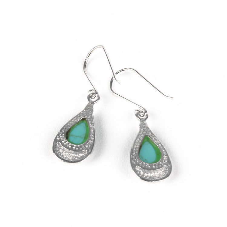 Small and elegant, these turquoise and sterling silver earrings are the perfect piece of jewelry to be worn daily. They have simple hooks that have a silver ball at the drop, adding a touch more style and grace. The earrings are about 1 1/2 in length, with the drop being about 3/4" long.