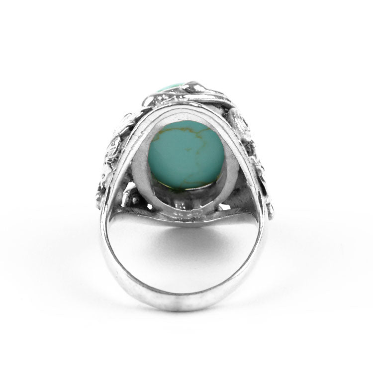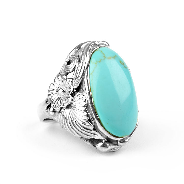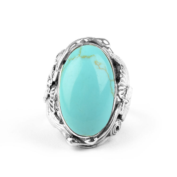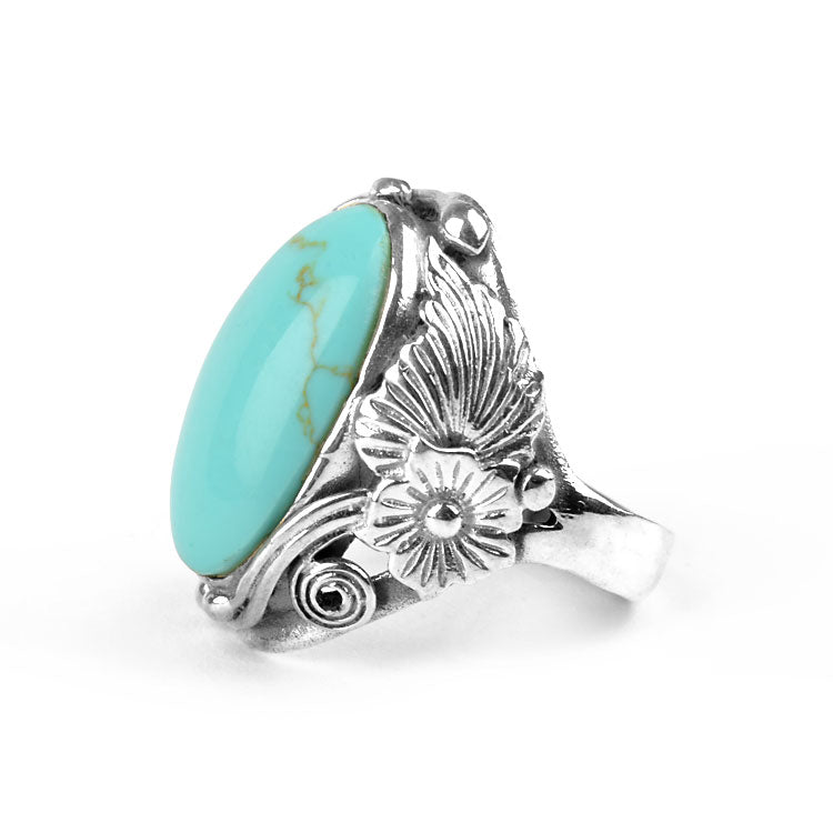 This fabulous ring features a large, natural turquoise stone (7/8" x 1/2") set in a delightful sterling silver design of flowers and leaves. This very comfortable ring is sure to grab the attention of jewelry and/or turquoise lovers! The entire face/top of the ring is about 1 1/8" long.