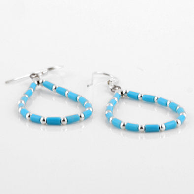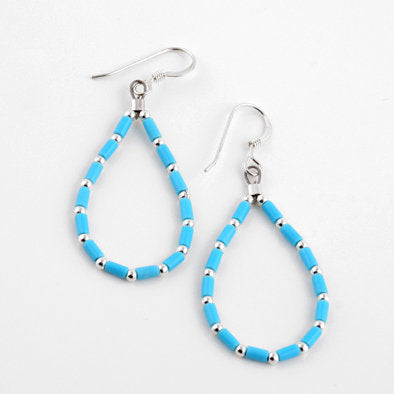 These earrings feature silver hooks and small natural turquoise beads. The earrings measure 2" in length.