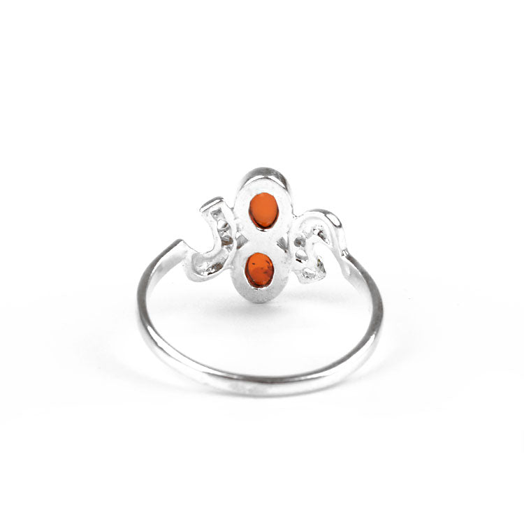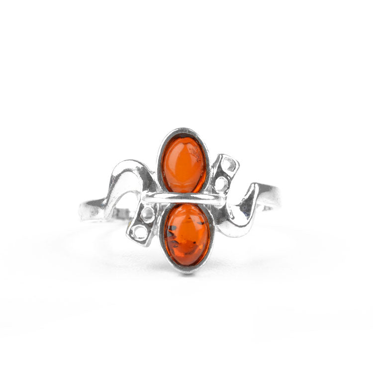 This hand-crafted ring is made up of a unique sterling silver design surrounding two separate and small honey amber stones. The amber is nearly 1/4" long and 3/16" wide. Ring's face measures about 1/2" by 1/2". The stylized silver features cut-outs and is the same on either side.