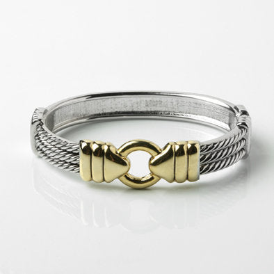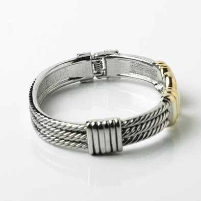 This silver tone metal bracelet resembles a fashionable belt. The band looks like three rope-like strands of silver, with a hinge and two silver belt loops. Features a gold tone buckle design.