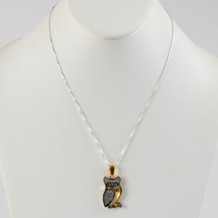 This fancy owl pendant features silver and gold tones, as well as textured metal. It is about 1 1/2" long (with bail included) and captures the eyes of many. This pendant makes the perfect present for bird watchers or owl lovers, and it goes with both gold and silver!