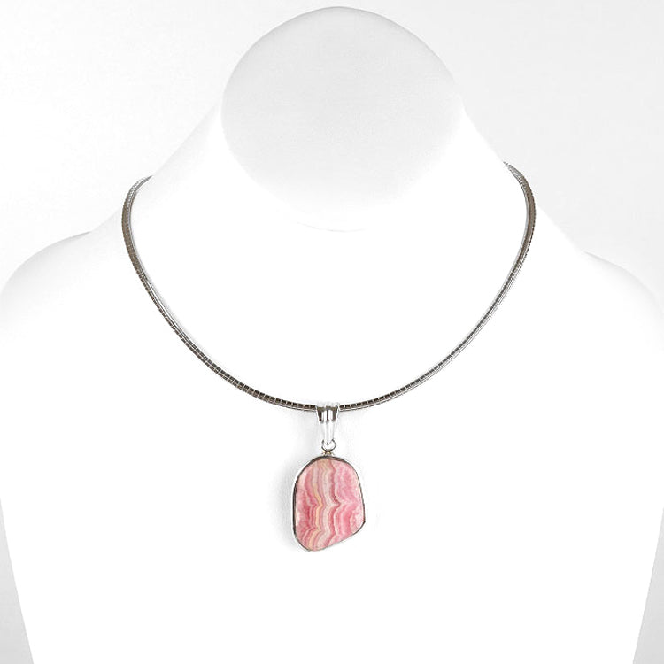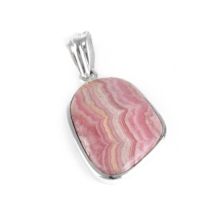 This hand-crafted pink gemstone and sterling silver pendant features a lovey rhodochrosite stone measuring Approximately 1" x 3/4" in size. Wavy lines of light and dark pink are what Rhodoschrosite is most known for, and this particular piece is in a unique shape. This pendant would be a great addition to a jewelry box. Looks great with a variety of chains.