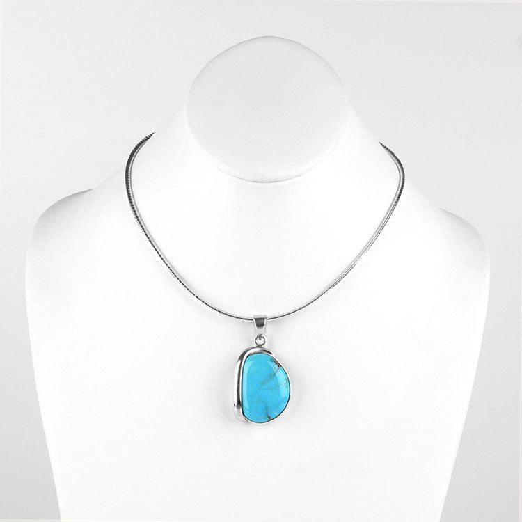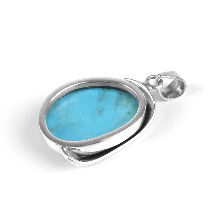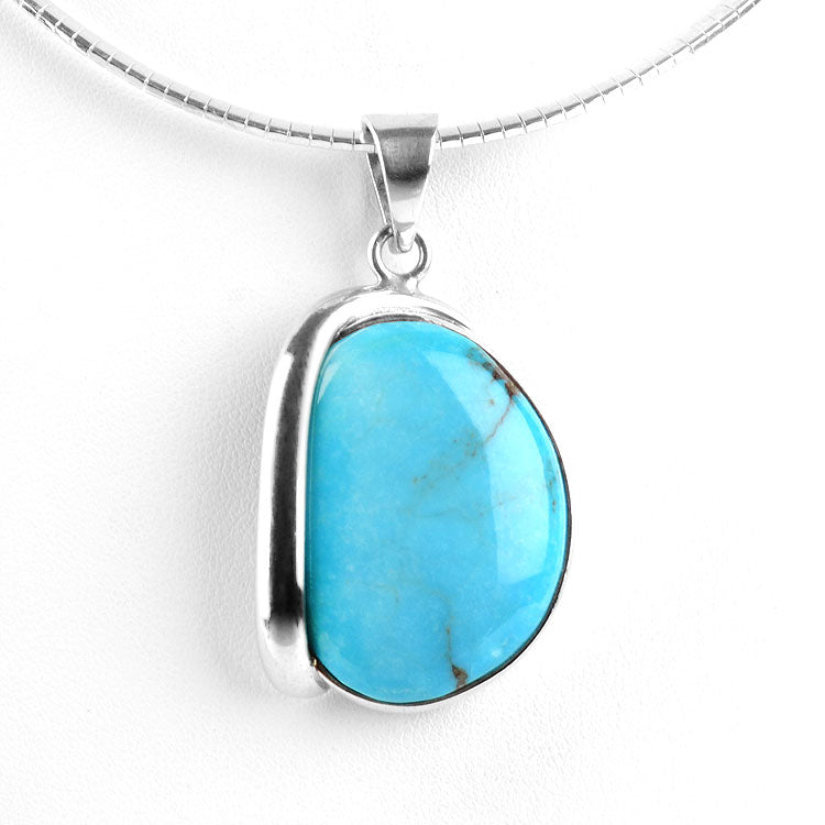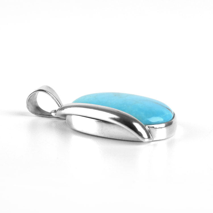 This unique blue turquoise pendant features a fun oval-like shaped polished natural turquoise gemstone, wrapped with smooth sterling silver. The blue color of this 1 1/4" x 3/4" gem is light and bright. This pendant has a total length slightly under 2" and a total width of 1"