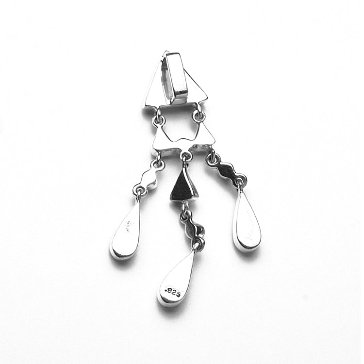 This unique sterling silver pendant features an array of beautiful turquoise stones. The pendant has a distinct southwestern feel to it. The stones range in size from 1/8" in length to 5/8" in length. The pendant itself measures 2 1/2" long by 3/4" wide.