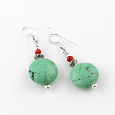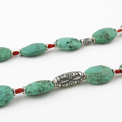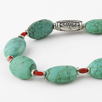 This set of turquoise jewelry features a necklace, and a set of earrings, both of which feature turquoise stones with a width of Approximately 3/4", along with sterling silver.