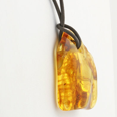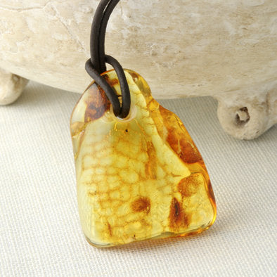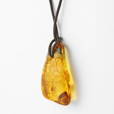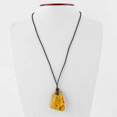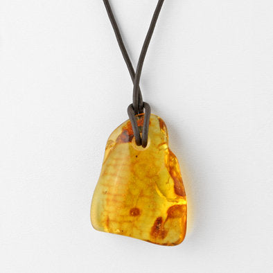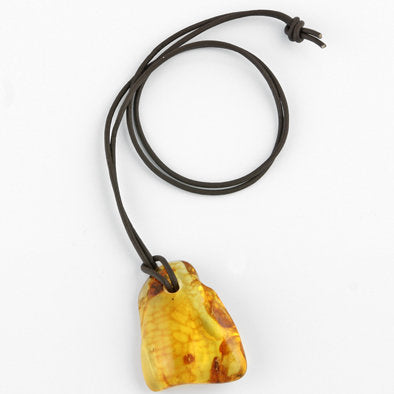 An irregular shaped honey Amber pendant hangs from a dark brown cord. The cord is looped through a hole drilled directly through the amber, preserving the natural look of this necklace. The pendant features many grooves and natural inclusions, tumbled by the sea to a semi-polished shine, making this a truly unique piece. Each piece of our jewelry is hand crafted and each amber stone has its own uniqueness, therefore they might slightly differ from the photograph.