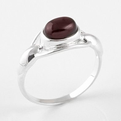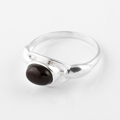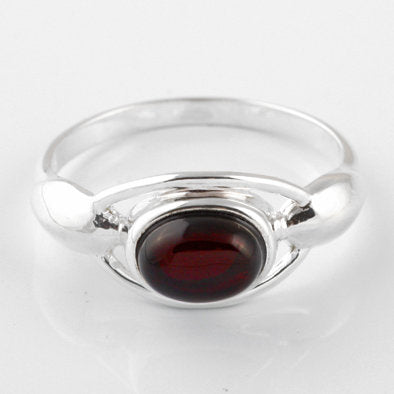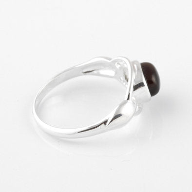 This unique ring features a cherry amber oval bezel set in an intricate .925 sterling silver band.