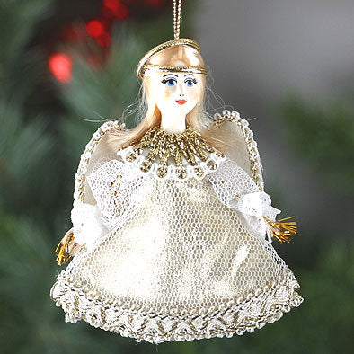 This unique Russian Christmas Angel features a hand-painted porcelain face and hand-crafted lace dress. This simple yet elegant ornament doll would make the perfect addition to any holiday décor.