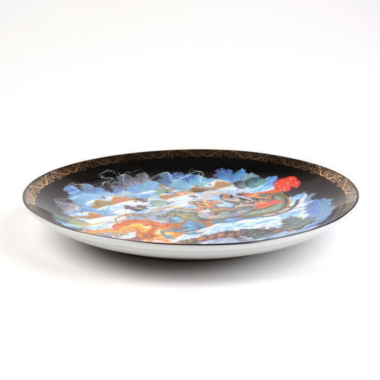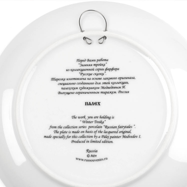 The work you are holding is "Winter Troika" from the collection series porcelain "Russian Fairytales". The plate was made what is on basis of lacquering original, specially have been created for this collection by Palej painter Medvedev I. Produced in limited addition. It looks beautiful on a stand or hanging on a wall (clear plastic stand included, metal hook for hanging included). This art piece is a lovely souvenir from Mother Russia! The plate is made of high quality porcelain and the picture is made in technique of decal so the price for this decorative plate is quite affordable.