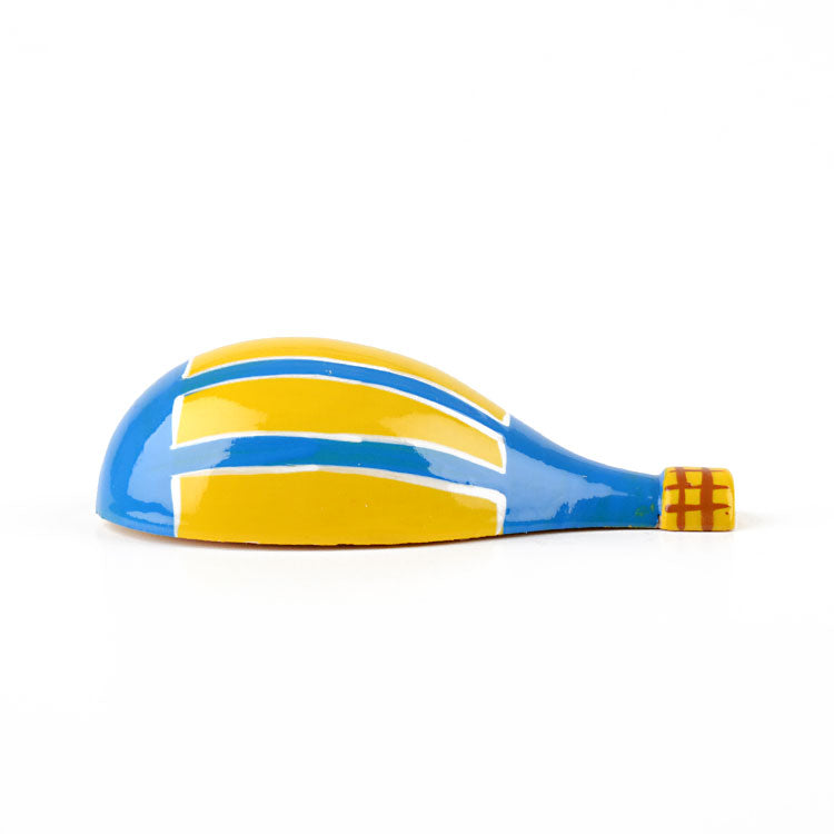 This blue and yellow wooden magnet was made in Russia. The wooden hot-air-balloon was hand-painted and then gloss-finished, just like the nesting dolls. About 3 1/2" long, 2" wide, and 1 1/8" thick. Contains one small magnet.